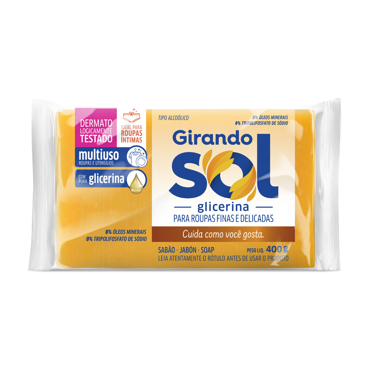 Sabão Em Barra Glicerina Girando Sol 400G, Sabão Glicerinado Em Barra Multiuso, Amarelo, Com Pura Glicerina, Rende E Dura Mais, Sua Casa Merece O Melhor Cuidado, Contém 1 Unidade De 400G
